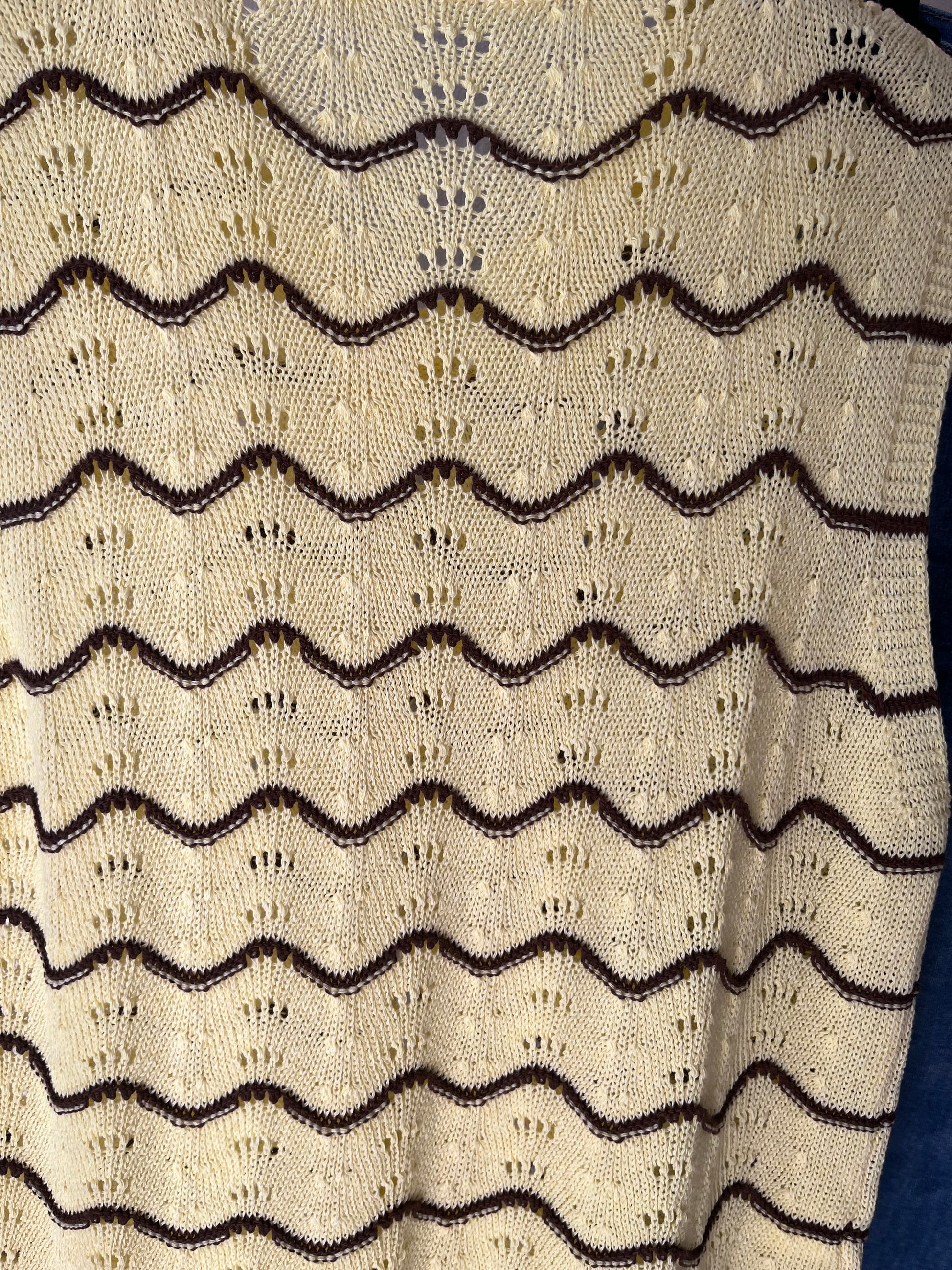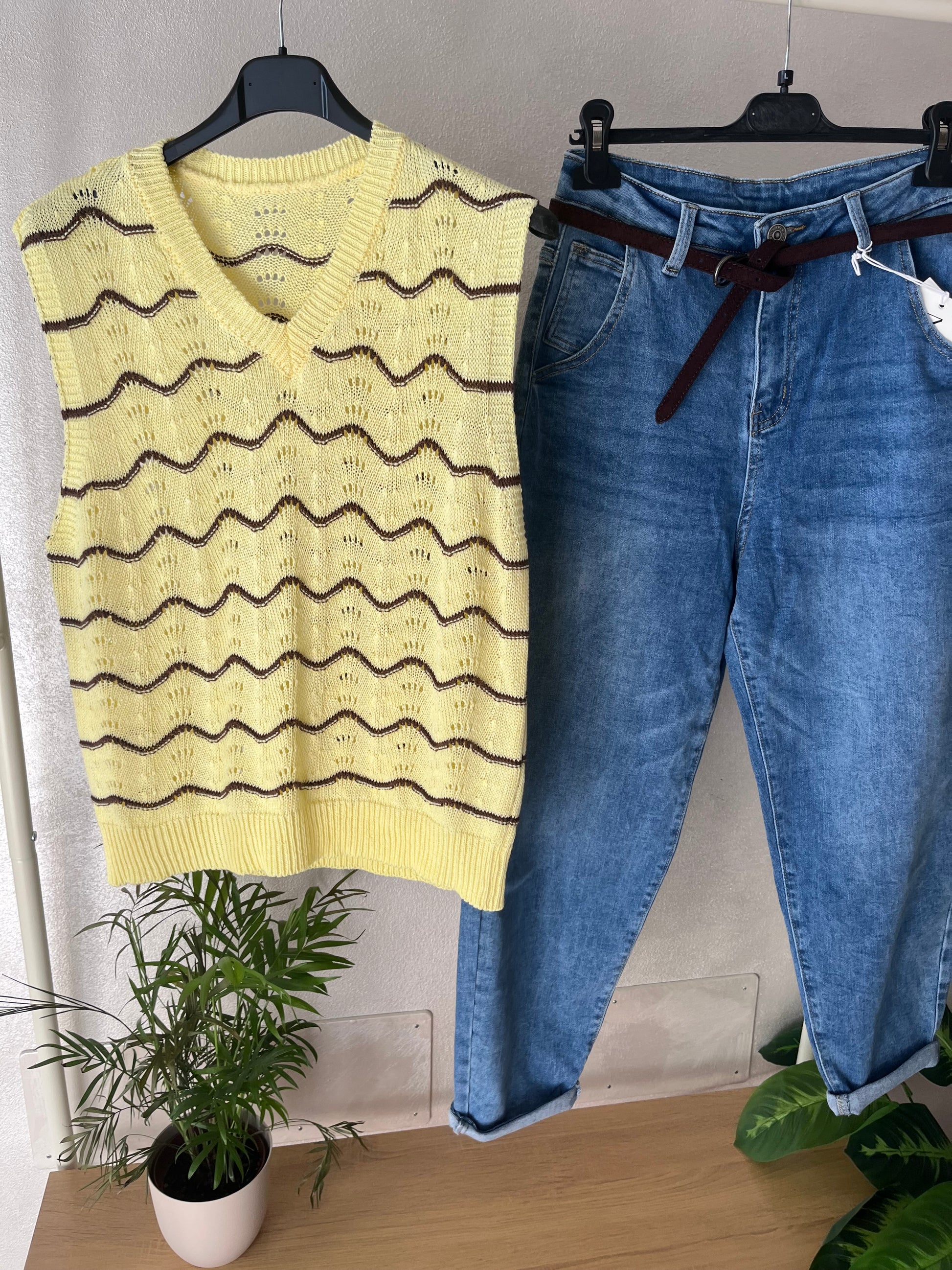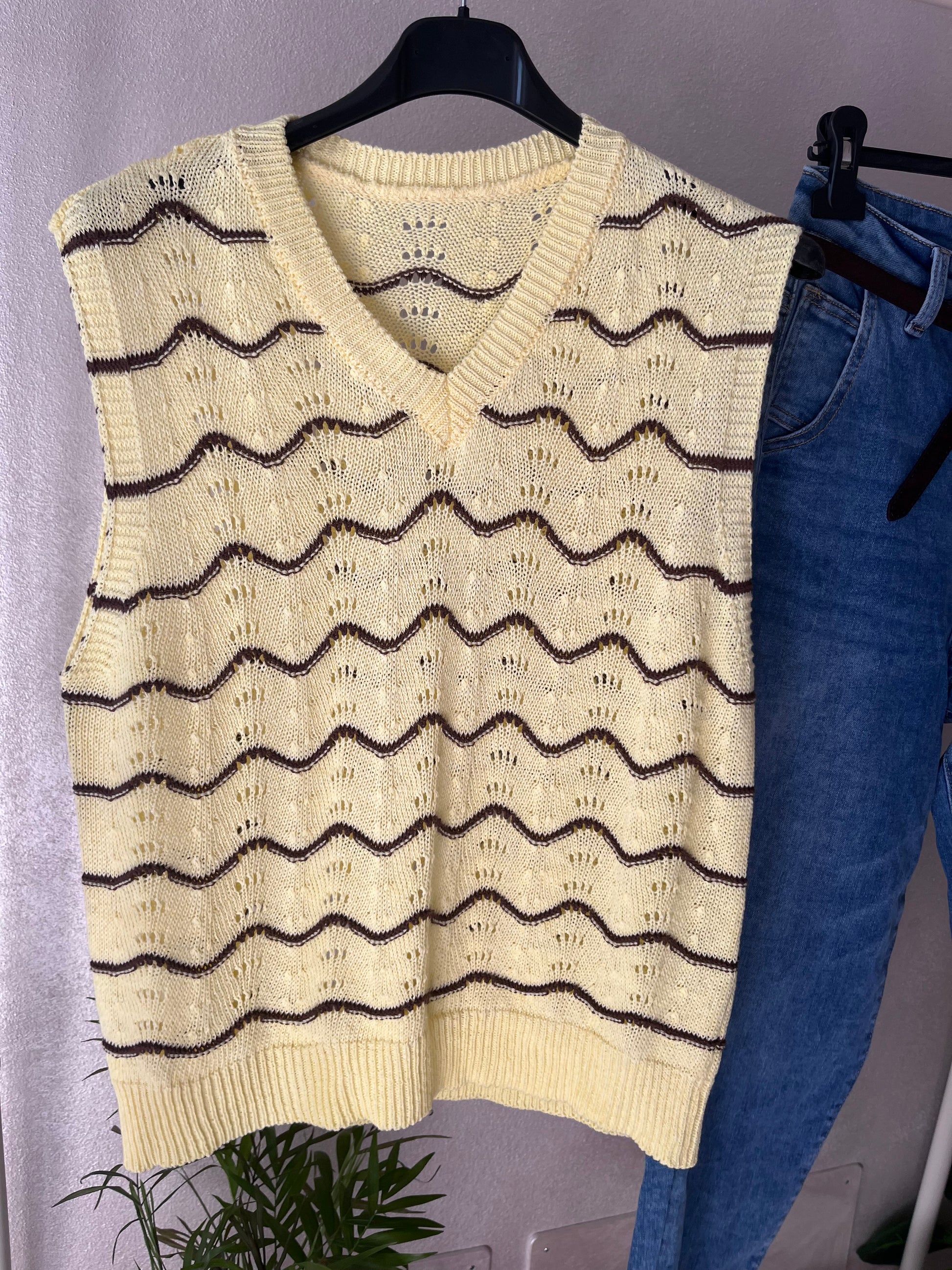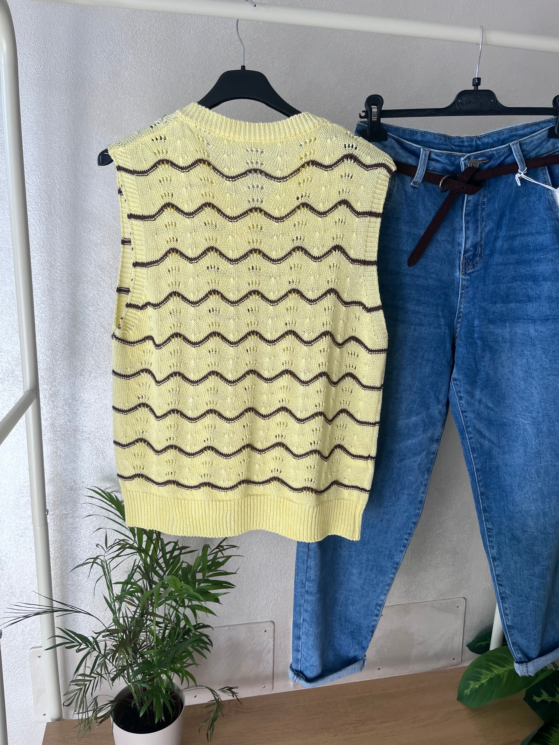 Gilet lavorato color giallo con righe marroni. Taglia unica.