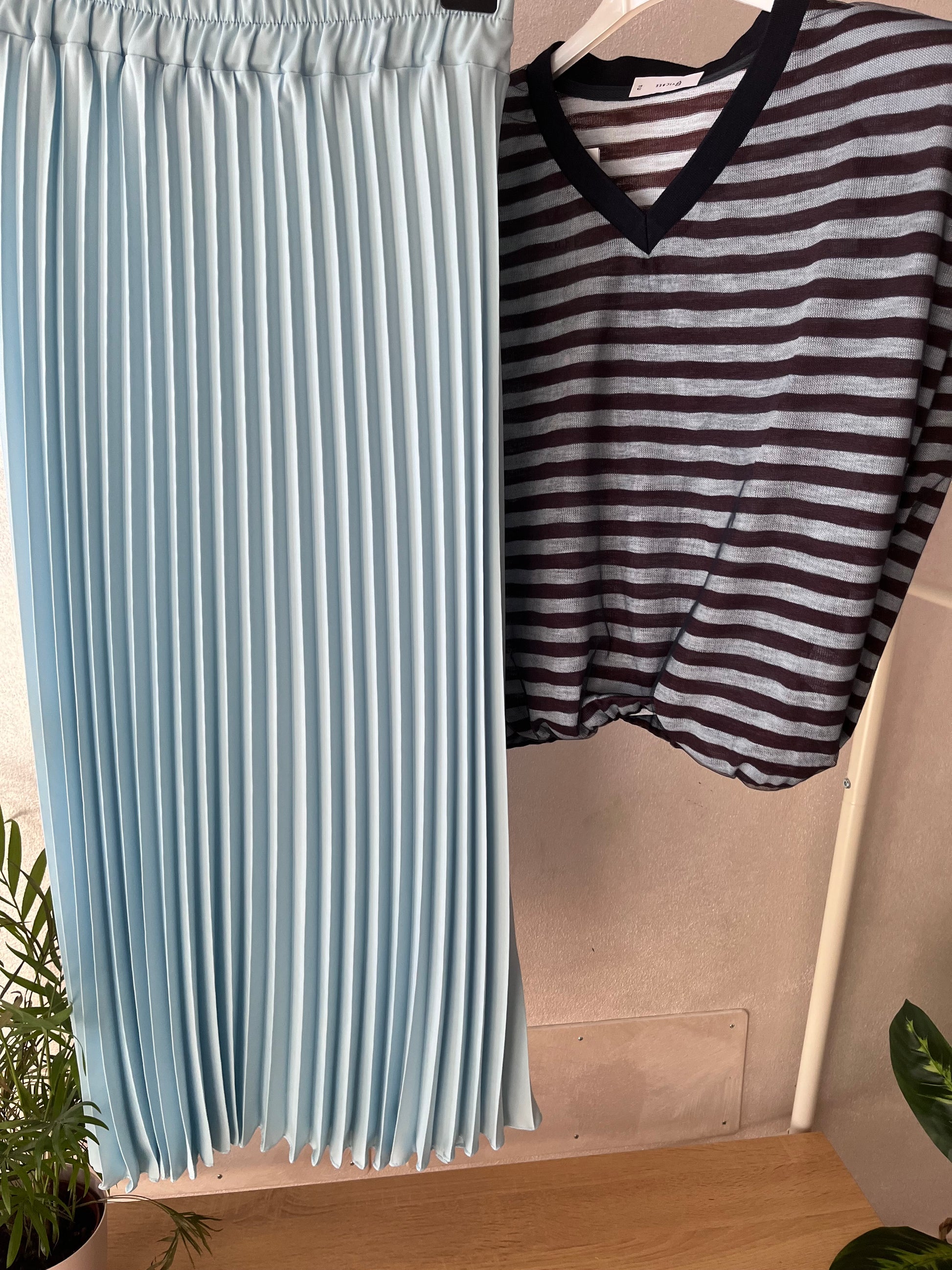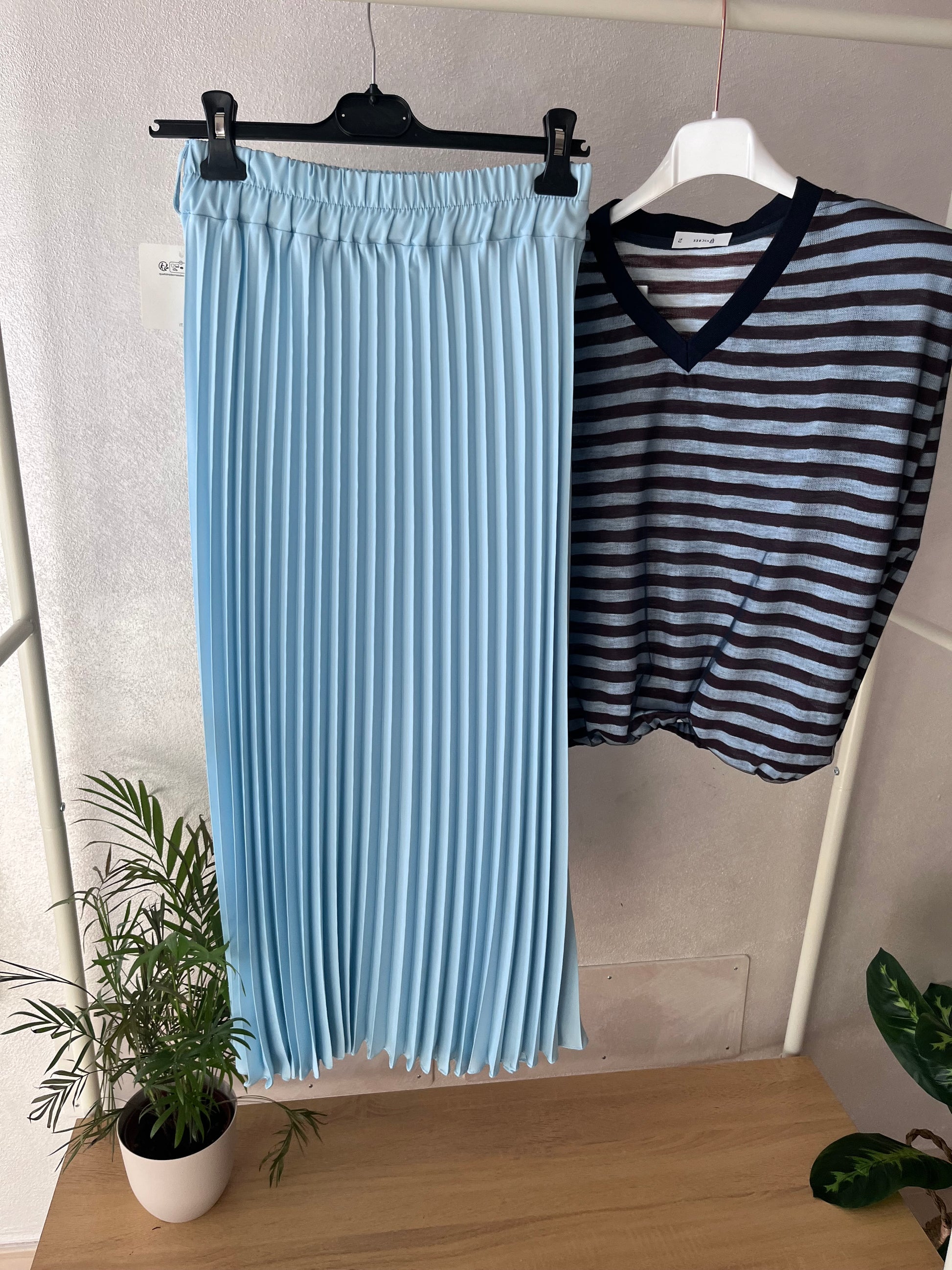 Gonna lunga plissettata, color celeste con elastico in vita. Taglia unica.