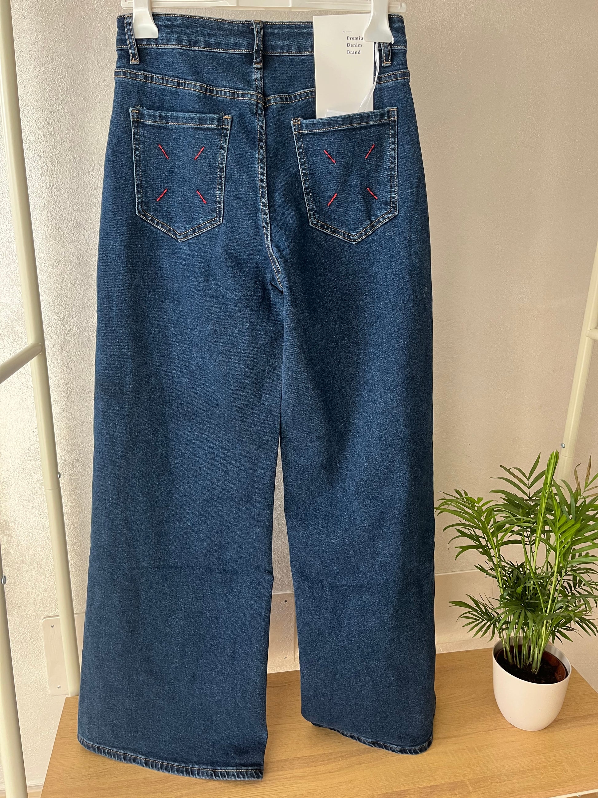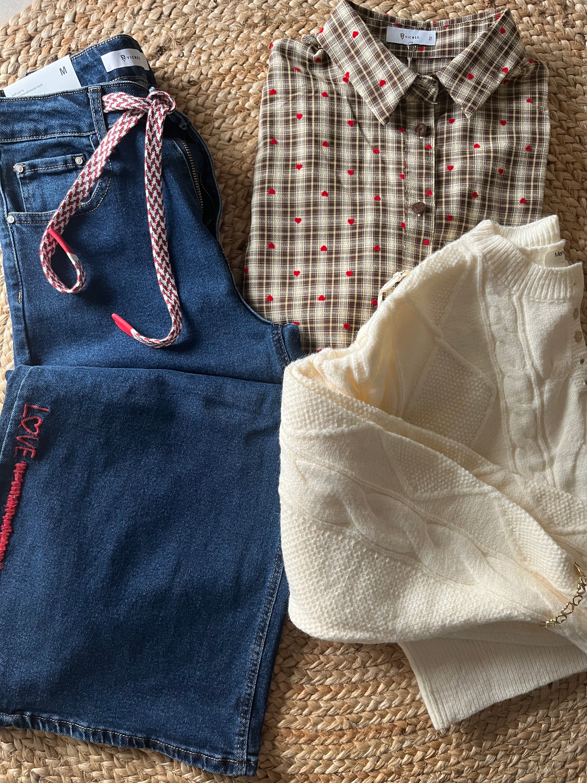 Jeans con scritta Love e cordino in vita. Dettagli cuciture rosse sulle tasche posteriori.