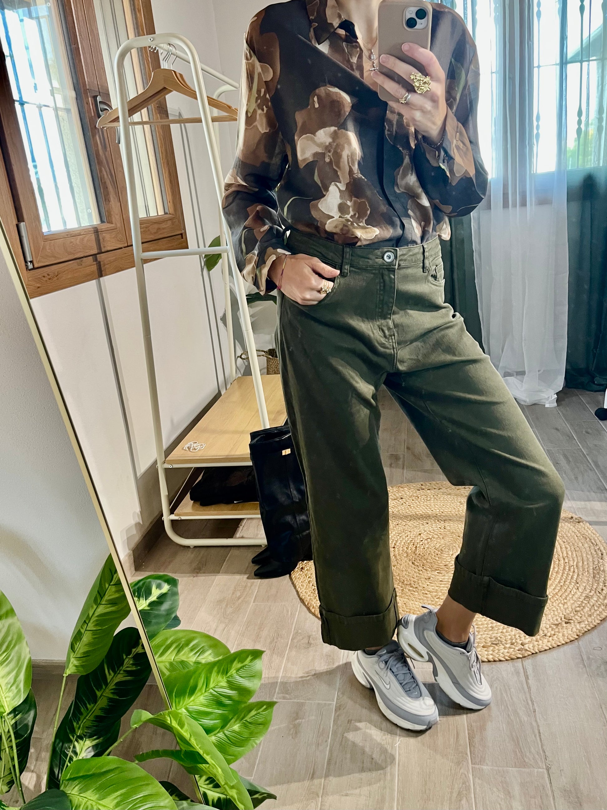 Jeans di cotone verde militare con dettaglio risvolto. La persona che lo indossa è alta 1,75.